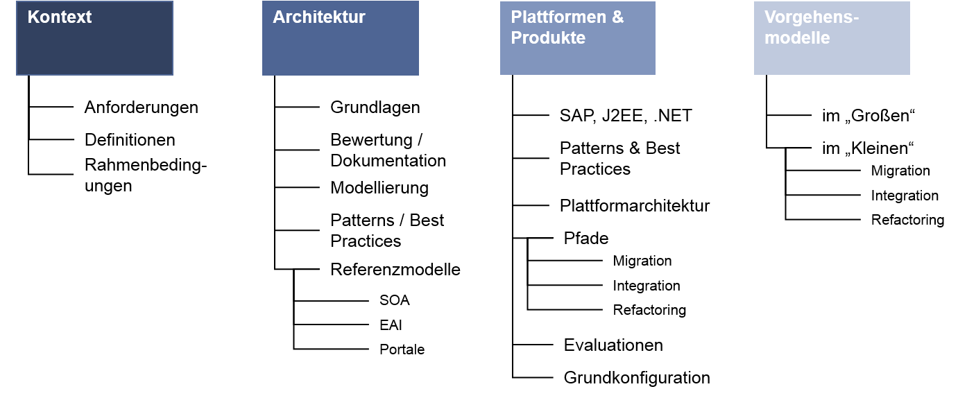 Das Paket "Architektur" umfasst die Dokumentation des aktuellen Stands der Wissenschaft und Technik im Bereich der IT-Architekturen auf der unternehmensweiten Ebene und Ebene der einzelnen Anwendung. Weiterhin gehört zu dem Arbeitspaket die Identifikation und Dokumentation bzw. Referenzierung von Patterns, Best Practices und Referenzmodelle/-architekturen im Bereich der IT-Architektur. Darüber hinaus sollen "handhabbare" Qualitätskriterien für Softwarearchitekturen mit dem besonderen Fokus auf der Frage der "Flexibilität" entwickelt werden. Im Arbeitspaket "Plattformen und Produkte" werden die Plattformen Mainframe, .NET, J2EE und SAP untersucht. Analog zum Arbeitspaket "Architektur" werden die Patterns und Best Practices identifiziert und dokumentiert bzw. referenziert. Das Paket umfasst auch die Untersuchung der jeweiligen Plattformarchitekturen und Evaluationen von konkreten Produkten innerhalb des Softec Competence Labs. Weiterhin werden in Hinblick auf die Vorgehensmodells die Migrations-, Integrations- und Refactoringpfade zwischen den Plattformen untersucht und dokumentiert. Auf Basis der Produktevaluationen werden szenario-spezifische Grundkonfigurationen erstellt, welche die Komplexität der zugrundeliegenden Produktinstallationen und -konfigurationen reduzieren.