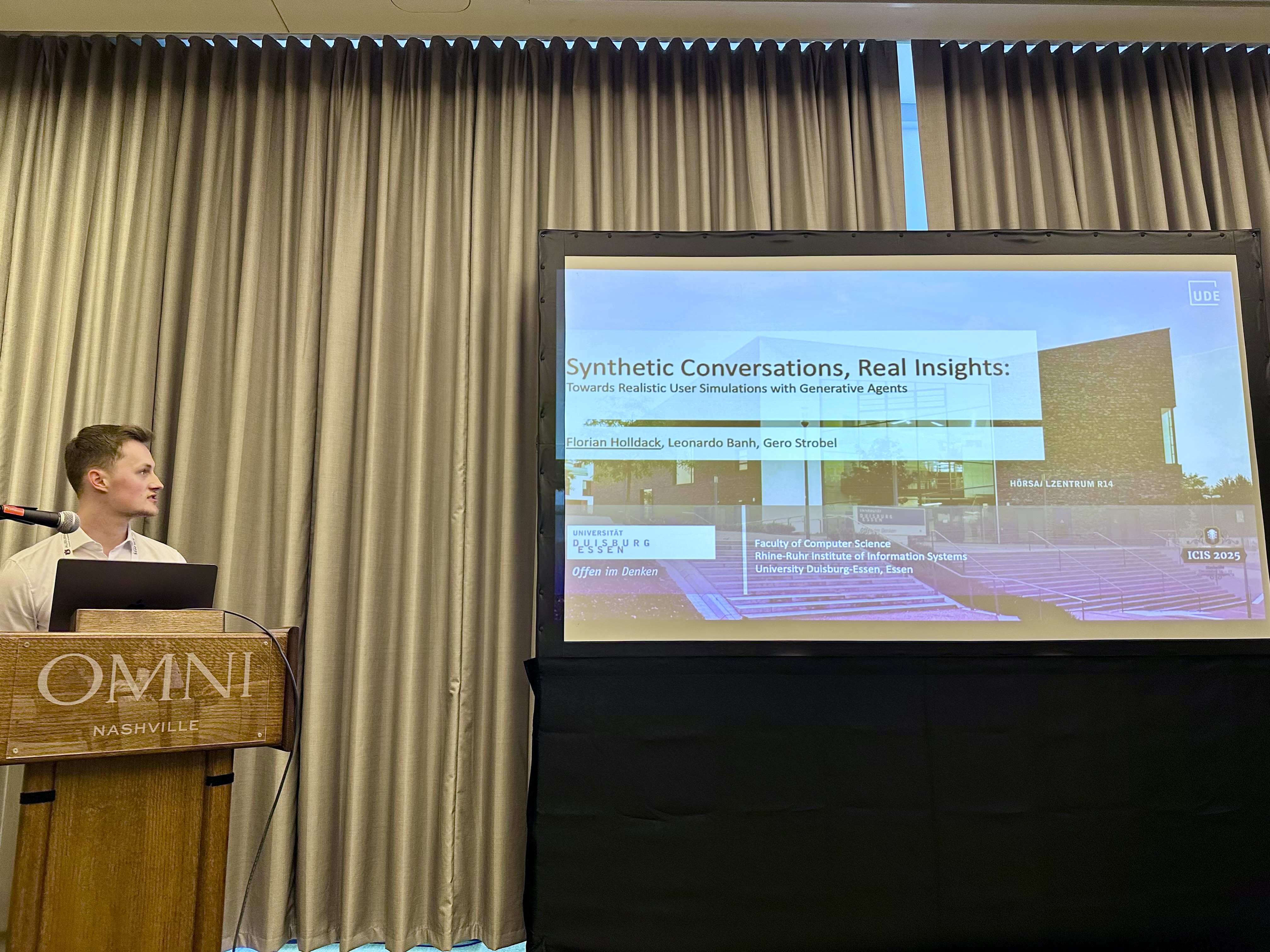 Auch auf internationaler Konferenzebene war der Lehrstuhl präsent: Auf der 46th International Conference on Information Systems (ICIS 2025) in Nashville, Tennessee, USA stellten Florian Holldack, Leonardo Banh und Gero Strobel ihr Paper “Synthetic Conversations, Real Insights: Towards Realistic User Simulations with Generative Agents” vor. Die Studie zeigt, wie generative Agenten auf Basis großer Sprachmodelle realistische Nutzersimulationen für die Evaluation dialogbasierter Empfehlungssysteme ermöglichen. Die Ergebnisse verdeutlichen, dass solche Agenten menschliche Bewertungen auf aggregierter Ebene gut approximieren können und damit eine skalierbare Alternative zu klassischen, aufwendigen Nutzerstudien darstellen.