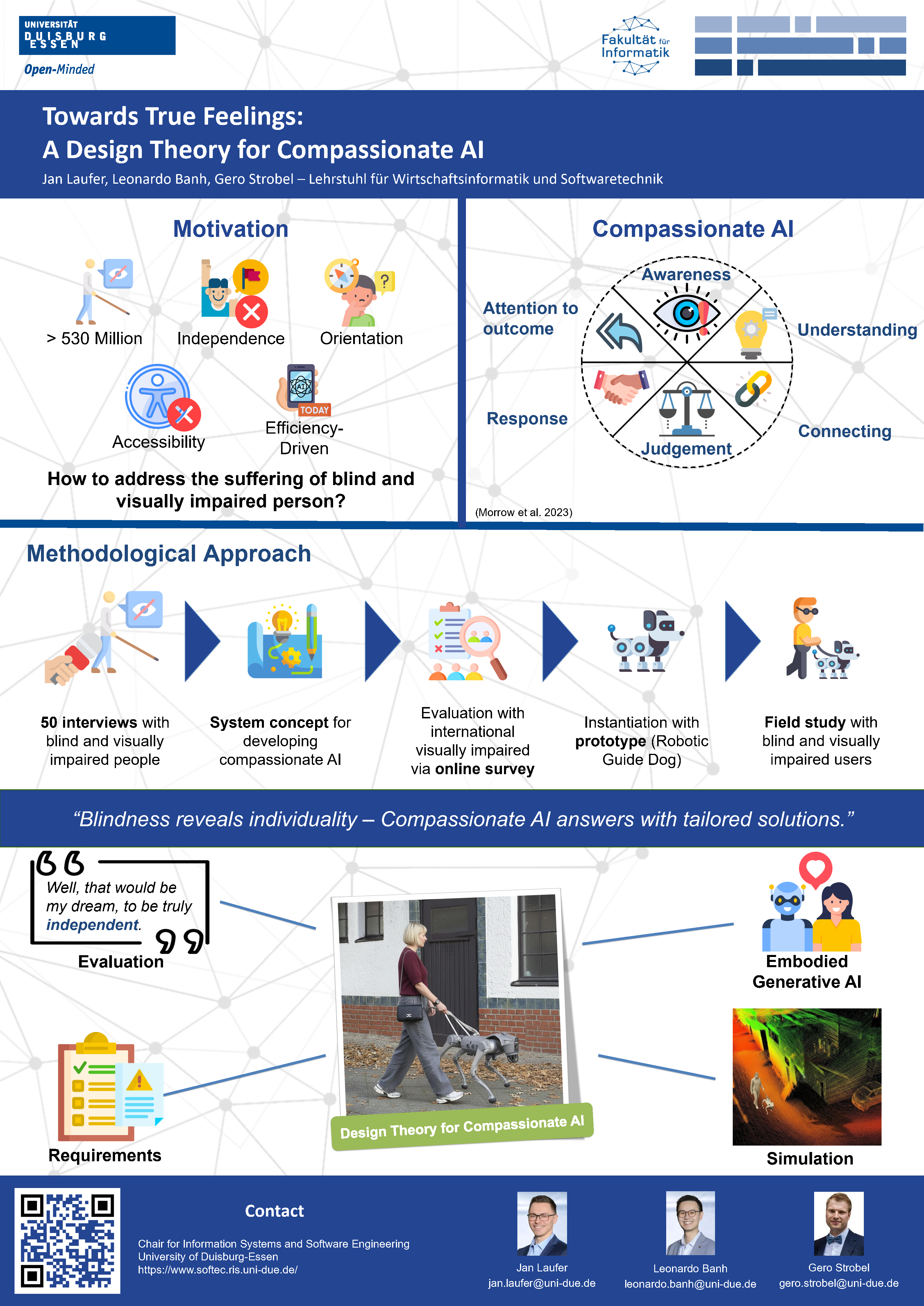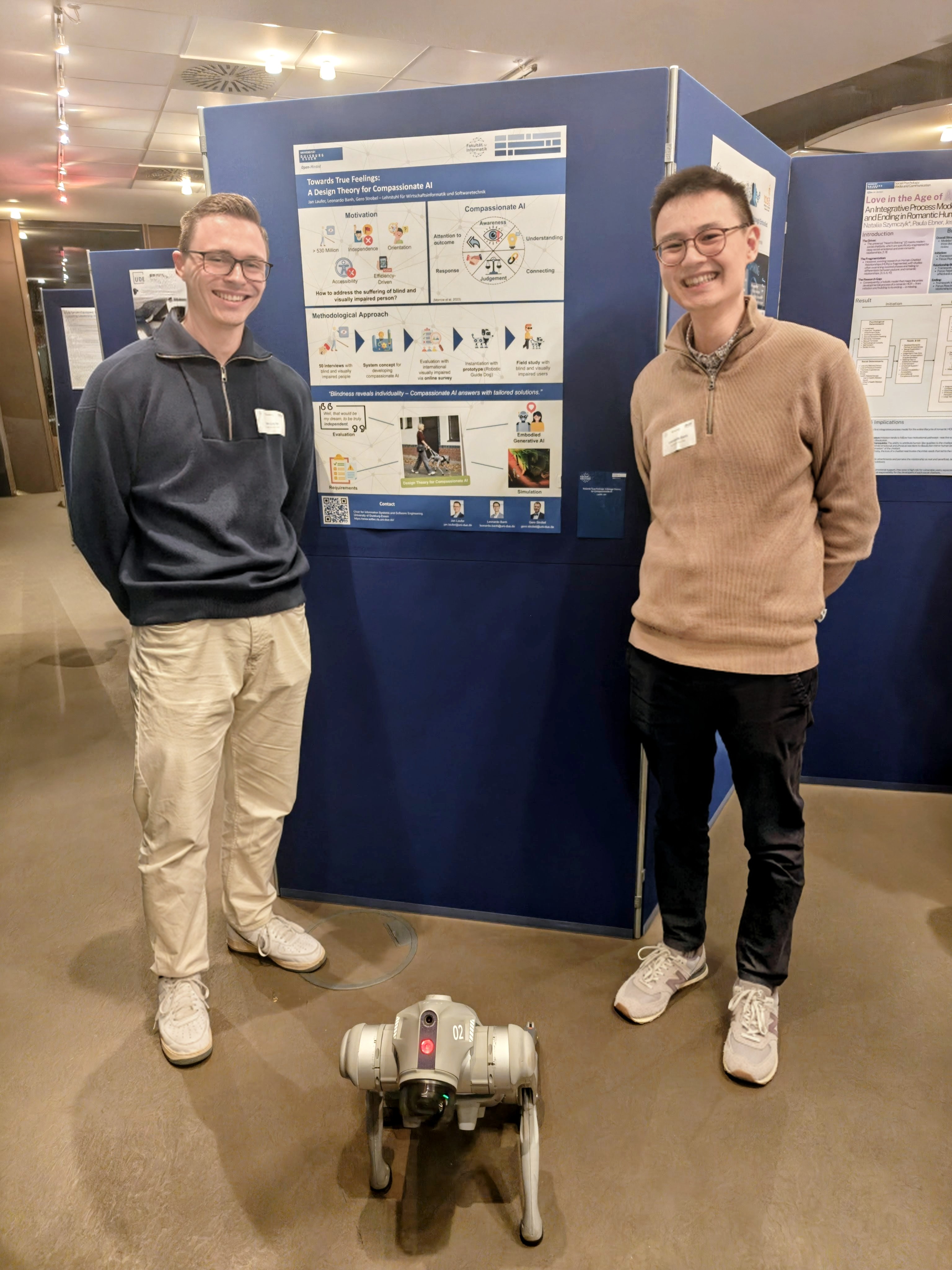 Auch der Lehrstuhl für Wirtschaftsinformatik und Softwaretechnik (SOFTEC) war mit einem Beitrag vertreten. Jan Laufer, Leonardo Banh und Gero Strobel stellten ihre aktuelle Forschung zum Thema “Towards True Feelings: A Design Theory for Compassionate AI” vor.