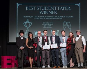 Zunächst gratulieren wir unserem ehemaligen Masterstudenten Ben Möllmann zu einer ganz besonderen Auszeichnung: Seine Veröffentlichung „Trust Me, I'm a Tax Advisor: Influencing Factors for Adopting Generative AI Assistants in Tax Law“, welche zusammen durch Leonardo Banh, Jan Laufer und Gero Strobel betreut und umgesetzt wurde, ist mit dem Best Student Paper Award der WI 2025 ausgezeichnet! Der Preis wurde im feierlichen Rahmen des Konferenzdinners unter dem Motto „The Great GatsWI“ verliehen.